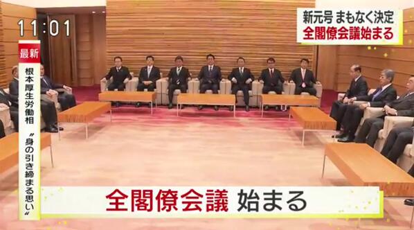 10时41分,菅义伟回到首相官邸准备参加全体阁僚会议。会上全体阁僚磋商后,最终召开临时内阁会议决定新年号。