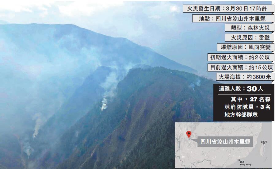 3月31日下午,撲火行動中,受風力風向突變影響,突發林火爆燃,瞬間形成巨大火球,在現場的撲火人員緊急避險,但27名森林消防隊員和3名地方撲火人員失聯。