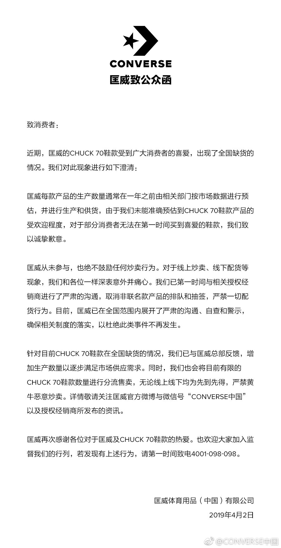 在这份致公众函中,匡威表示,由于未能预估CHUCK70鞋款的受欢迎程度,部分消费者无法在第一时间买到喜爱的鞋款,对此向公众致歉。同时,公函称匡威从未参与、也绝不鼓励任何炒卖行为,品牌方已第一时间与相关授权经销商进行了严肃沟通,取消非联名款产品的排队和抽签,严禁一切配货行为。