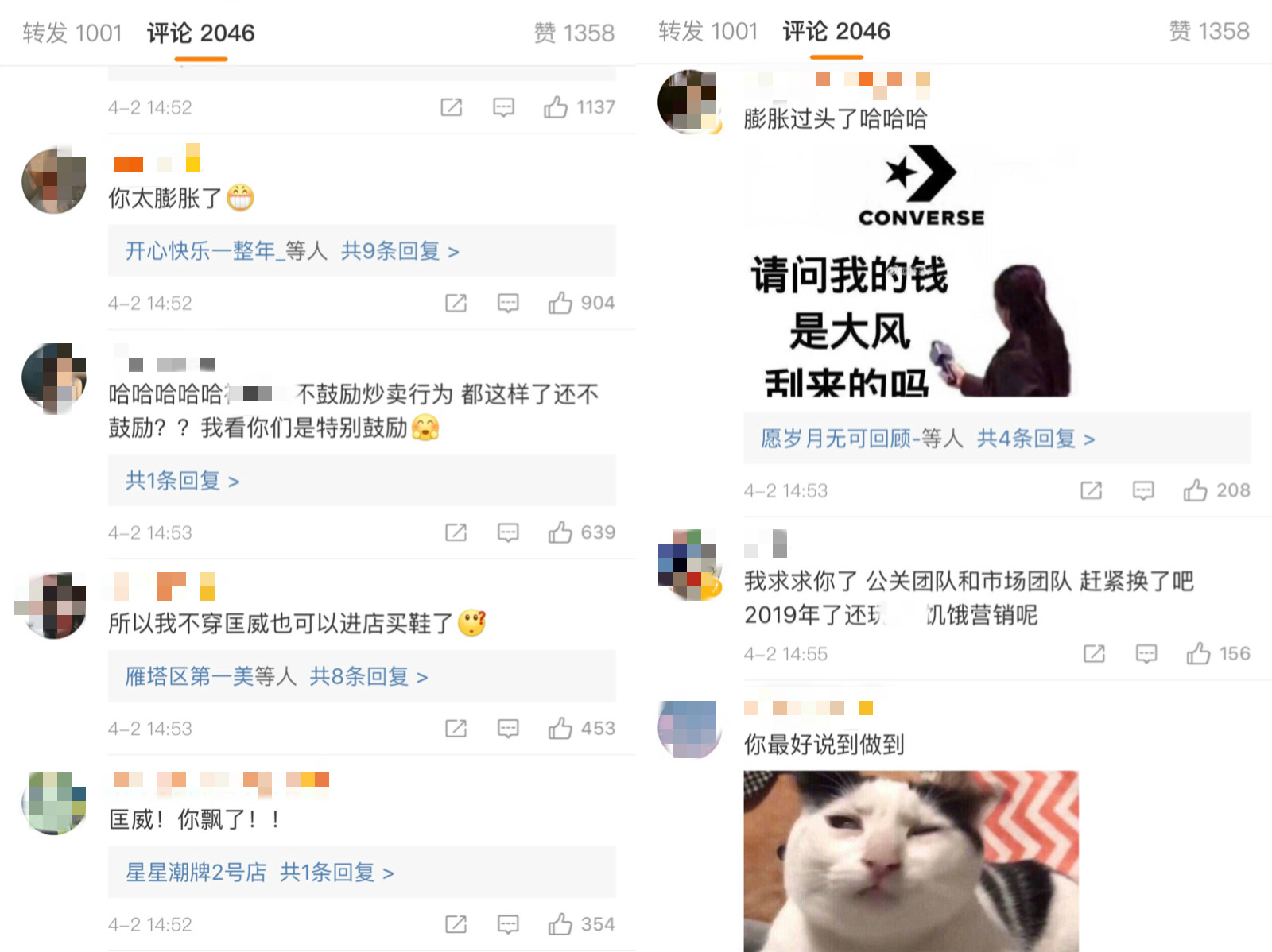 匡威品牌下午发出的这份致公众函,并未得到公众的谅解,网友的质疑难以平息:“请尊重品牌这句话,尽显了你们莫名的优越感!”“您快闭嘴吧!合着是我们自己把匡威买贵了这个意思?”不穿匡威的鞋和衣服还不让进店买东西了?真是膨胀过头了!”