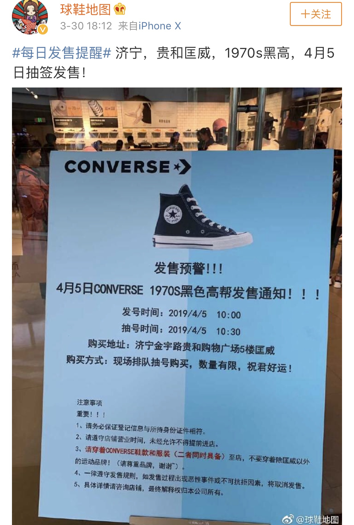 此前,有网友发图爆料,济宁金宇路贵和购物广场匡威店张贴出的“发售预警”显示,1970S黑色高帮鞋将于4月5日启动抽签发售。随后,众多网友表示了对这种发售方式的不满:“买双帆布鞋搞这么多花样,都是给惯的!”“鞋市真是越来越畸形了!”