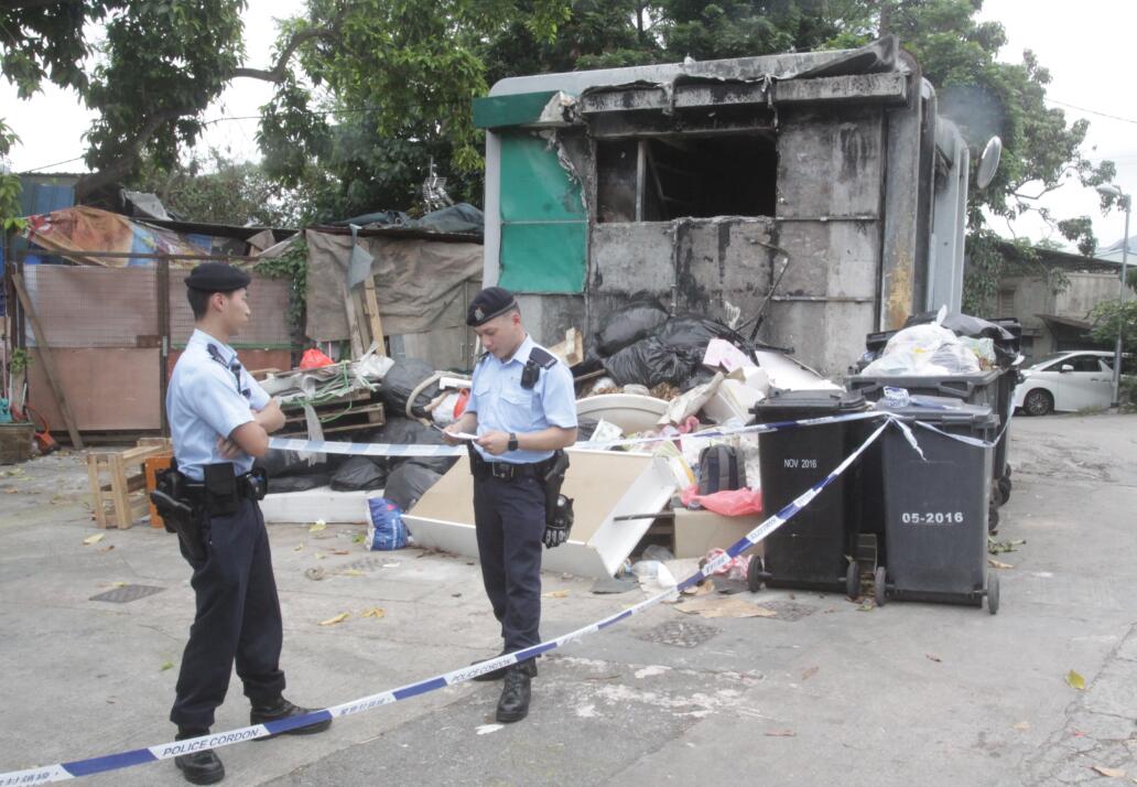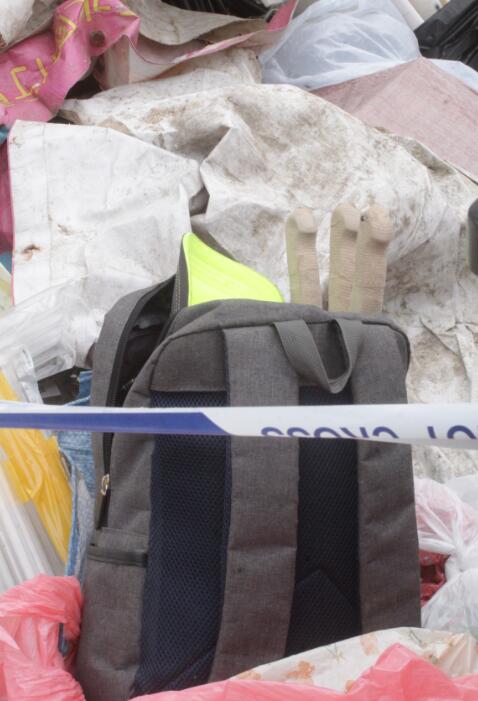 警方在丹桂村垃圾房尋回涉案背囊及3把利刀。 記者 區天海攝