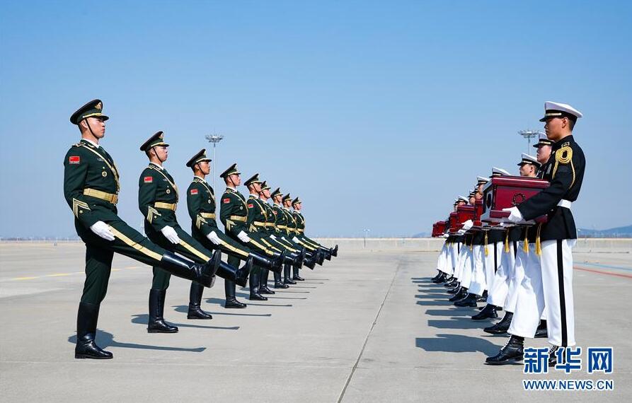 4月3日,在韩国仁川国际机场,韩方(右)向中方礼兵交接中国人民志愿军烈士遗骸。新华社