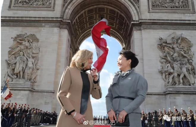 凯旋门下举行欢迎仪式很罕见。许多民众为了一睹盛况,寒风凛冽仍坚持全程观礼。