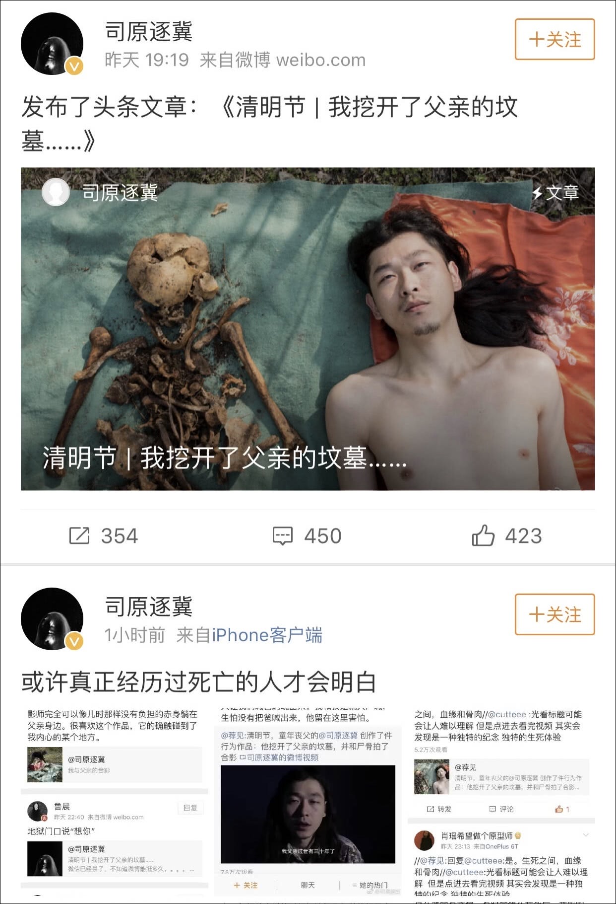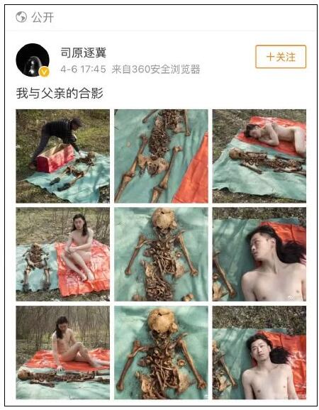 “清明节,我挖开了父亲的坟墓……”这是摄影博主@司原逐冀4月6日发布在微博的文章。为了“完成自己的愿望”, 他趁着清明节回老家修新坟,赤身裸体与自己父亲的尸骨拍摄了一组照片。
