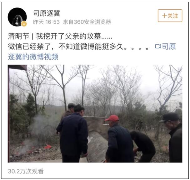 据@司原逐冀发布在微博的长文和视频介绍,三十年前,他父亲因为肝癌去世,年仅28岁。这次清明节回到老家,@司原逐冀目的是为父亲迁一座新坟。因为在我国部分地区,“土葬”的传统目前仍然保留,而“迁墓”也是土葬的风俗之一,如果坟地不佳或者保存状态不好,可能需要迁墓,只要选好地址,看好日子就可以迁。