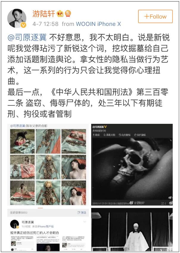 对于这些照片和文章视频,反对的网友认为这是@司原逐冀在“标榜自己”,不能算是“新锐艺术”,是为了“制造舆论”。还有网友举出了他曾经的作品,认为他的行为是对尸体的“侮辱”。