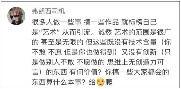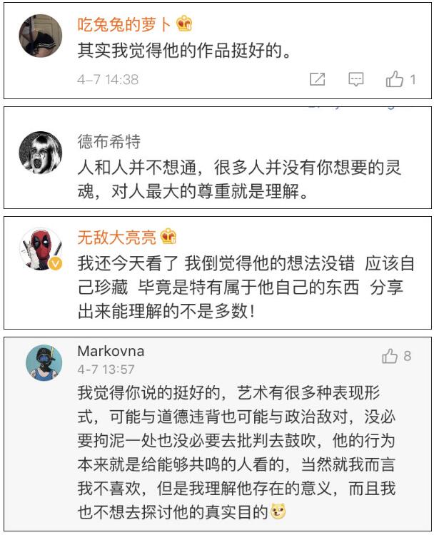 但也有支持的朋友表达出了自己的观点,认为“对人最大的尊重就是理解”,因为“艺术有很多中表现形式”,而且“毕竟是特有属于他自己的东西”。