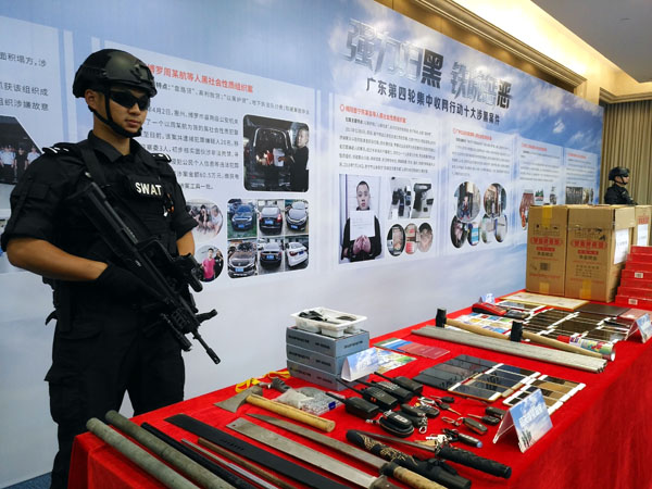到3月底,全國起訴涉黑涉惡犯罪案件14226件 79018人,圖為內地警方展示涉黑罪證。