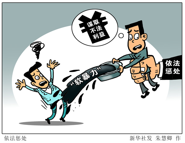 掃黑辦昨天還提出對辦理實施「軟暴力」的刑事案件的意見,明確「軟暴力」是指行為人為謀取不法利益或形成非法影響,對他人或者在有關場所進行滋擾、糾纏、哄鬧、聚眾造勢等,足以使他人產生恐懼、恐慌進而形成心理強制,或者足以影響、限制人身自由、危及人身財產安全,影響正常生活、工作、生產、經營的違法犯罪手段。包括跟蹤貼靠、揚言傳播疾病、揭發隱私等。