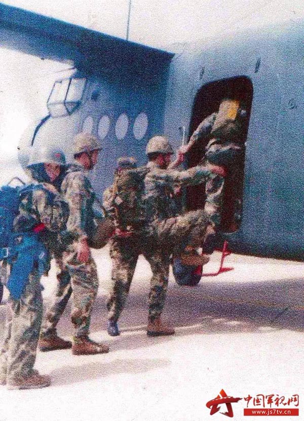 馬旭(左一)早年參加跳傘訓練。