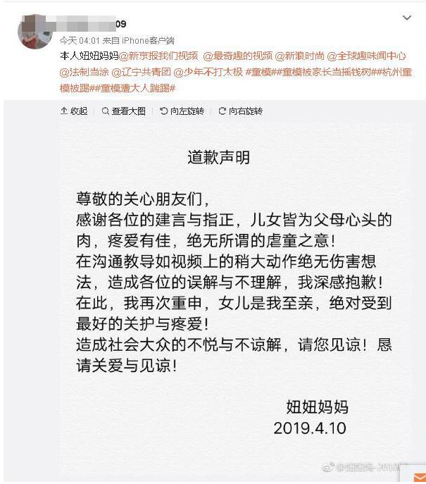 4月10日凌晨4点,一个名为“妞妞妈 -201009”的微博用户发布道歉声明称,自己是妞妞的妈妈,视频中并非在虐童,而是“在沟通教导”。