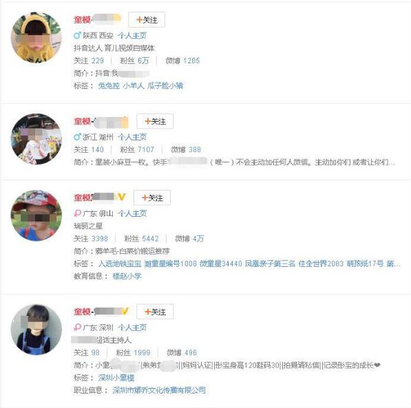 但由于现在流行打造网红、网红店,因此很多父母不去找专门的公司,而是自己通过直播平台把孩子包装成网红,等孩子火了后就拿着粉丝数去跟商家报价、谈合作。“这类网红童模微博上有很多。”徐秀明表示,这类 “家庭作坊”也会引发各种问题,“一个是孩子没经过专业演员培训,一个是家长可能眼里只有钱。”