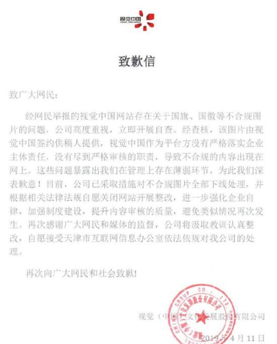视觉中国在其官方微信发布整改通知,经网民举报的视觉中国网站存在关于国旗、国徽等不合规图片的问题,公司高度重视,立即开展自查。经查核,该图片由视觉中国签约供稿人提供,视觉中国作为平台方没有严格落实企业主体责任,没有尽到严格审核的职责,导致不合规的内容出现在网上。这些问题暴露出视觉中国在管理上存在薄弱环节,为此视觉中国深表歉意。目前,公司已采取措施对不合规图片全部下线处理,并根据相关法律法规自愿关闭网站开展整改,进一步强化企业自律,强化制度建设,提升内容审核的质量,避免类似情况再次发生。再次感谢广大网民和媒体的监督,公司将汲取教训认真整改,自愿接受天津市互联网信息办公室依法依规对本公司的处理。