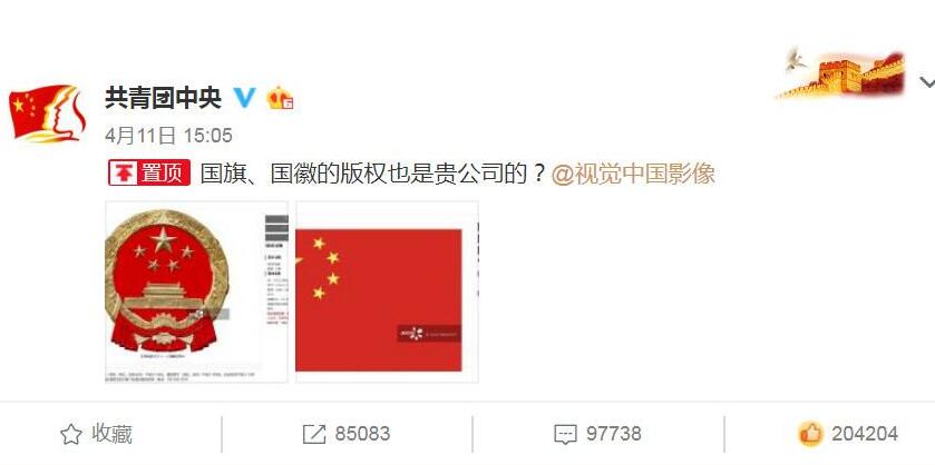 昨天上午,有網友發現,10晚公布的人類史上首張「黑洞照片」,在版權商視覺中國網站上出現,並注明「此圖僅限於編輯用途,如用於商業用途,致電或諮詢客戶代表」。這意味着視覺中國擁有這張黑洞照片的版權。昨天下午,共青團中央官方微博發布了一條微博,顯示視覺中國將國旗、國徽作為版權圖片出售,怒懟視覺中國,「國旗、國徽的版權也是貴公司的?」該微博瞬間登上熱搜第一。隨後,包括鳳凰網、百度、新浪、蘇寧等知名企業也紛紛在評論下發出質疑,數十家企業貼出了與自家企業相關的照片,被收入視覺中國版權庫。甚至有網友發現,包括《紅樓夢》等一些影視作品的劇照,也被視覺中國用於出售。
