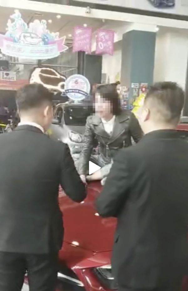 ◆4月9日 女車主前往4S店討說法維權,情急之下坐在了一台紅色平治展車引擎蓋上,向圍觀群眾哭訴了自己的這段購車維權遭遇。