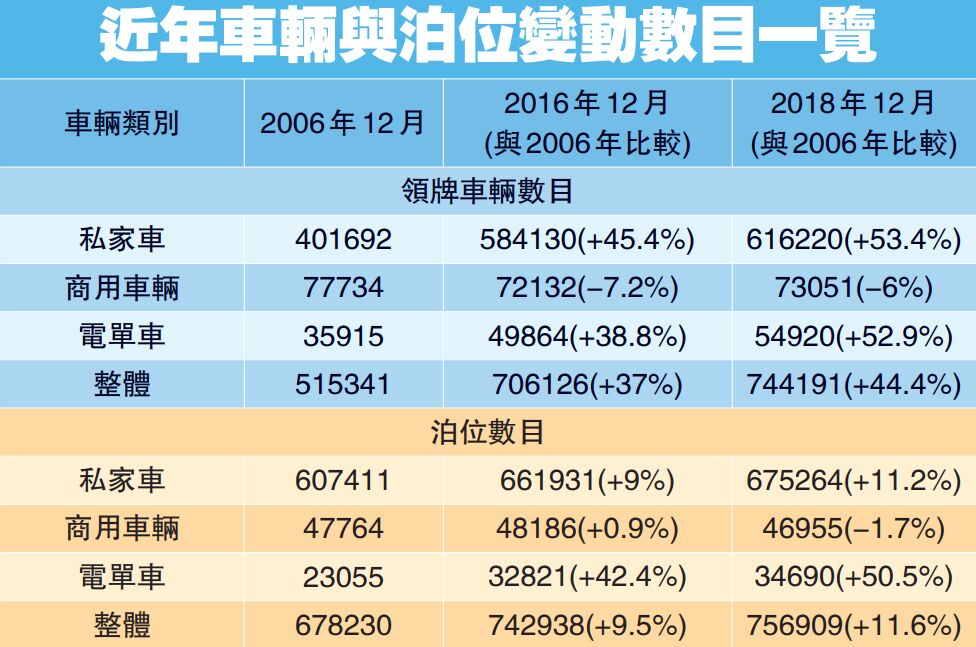 審計署表示,在2006年12月至2018年12月期間,本港領牌車輛(私家車、商用車輛和電單車)數目由515341輛增至744191輛、增幅達44.4%,但泊車位總數僅由678230個增至756909個、增幅僅11.6%,導致整體的泊車位與車輛數目比例(泊車位比例)由1.32降至1.02。報告認為,政府應檢討各區公眾停車場的規劃標準。