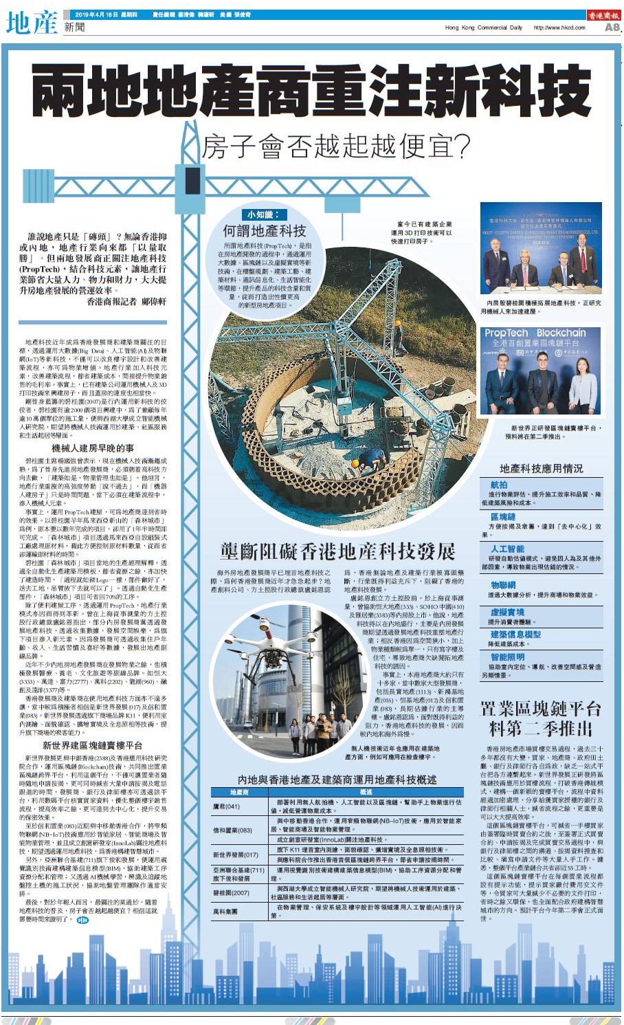 【香港商報網訊】誰說地產只是「磚頭」?無論香港抑或內地,地產行業向來都「以量取勝」。但兩地發展商正關注地產科技(PropTech),結合科技元素,讓地產行業節省大量人力、物力和財力,大大提升房地產發展的營運效率。