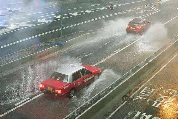 「倒水式」的傾盆大雨,瞬間淹浸馬路,車輛駛經水花四濺。記者 馮瀚文