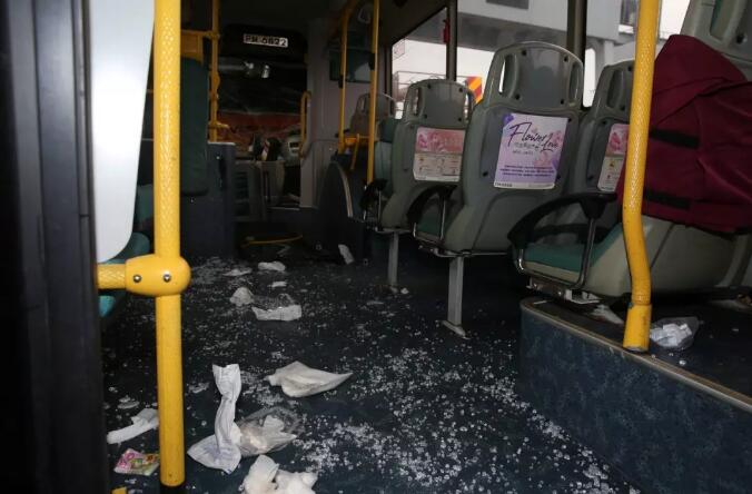 从照片可见,有巴士挡风玻璃破裂,车厢内留有大滩血渍,一地染血纸巾。受意外影响,交通挤塞,车龙逾两公里长。