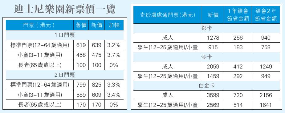 據香港迪士尼公布的票價調整,標準票及年票平均加幅3%。其中成人門票由619元加至639元,加幅達3.2%;小童門票由458元加至475元,加幅為3.7%;長者門票則維持100元不變。