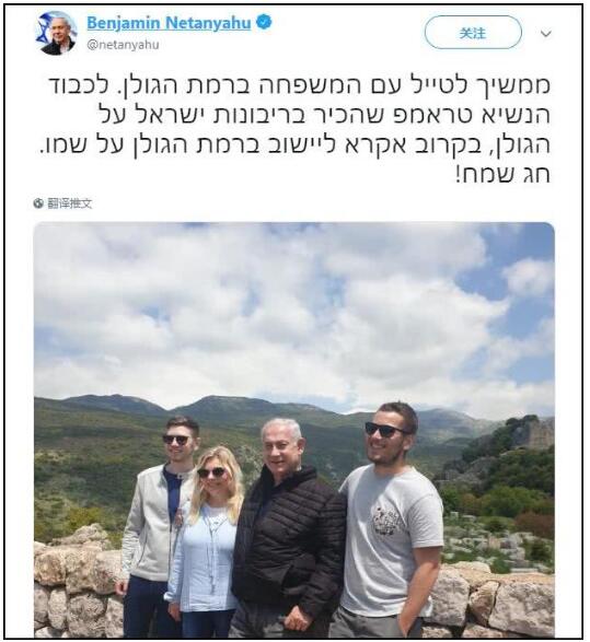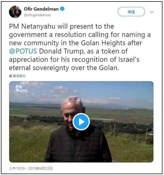 在特朗普宣布美国承认以色列对戈兰高地拥有主权一个月后,内塔尼亚胡23日当天在推特上宣布,他将要求政府以“唐纳德·特朗普”之名命名戈兰高地一处犹太人定居点,以表示对特朗普的感谢之情。
