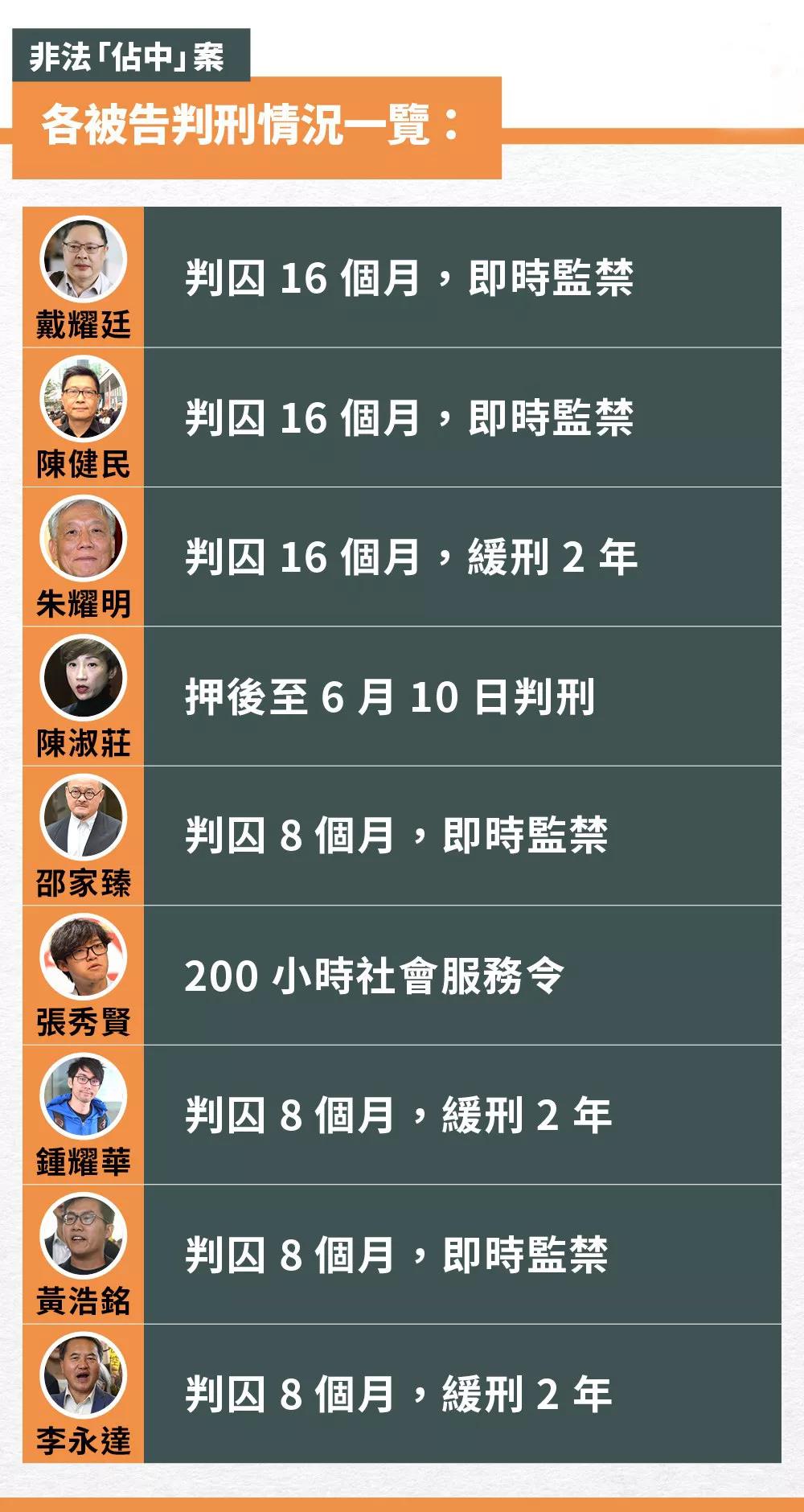 非法“占中”其中两名发起人戴耀廷及陈健民的第一项控罪“串谋公众妨扰”,判实时入狱16个月;第二项控罪“煽惑他人煽惑公众妨扰”,判监8个月,同期执行,即是两人各合共监禁16个月,需实时入狱。另一名发起人朱耀明,同样因“串谋公众妨扰”罪,判监16个月,但获缓刑2年。
