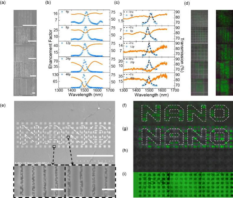 突破一:超構表面加密顯示技術 隨着信息技術的不斷發展,信息安全加密問題日益突出,信息加密技術和加密手段的研究與開發受到全社會的關注。研究論文《通過非線性超表面諧振增強鈣鈦礦三光子熒光實現光學加密》(「Resonance-enhanced Three-photon Luminesce via Lead Halide Perovskite Metasurfaces for Optical Encoding」)致力於解決信息安全加密問題,通過鈣鈦礦的非線性光學性能設計超構表面,實現了光學加密。 該研究為非線性光學在顯示和加密領域的首次應用,哈工大(深圳)材料科學與工程學院2017級博士生范宇斌、2017級碩士生王宇涵為共同第一作者,肖淑敏、宋清海和新加坡國立大學教授仇成偉為共同通訊作者。 基於鈣鈦礦優異的非線性特性,研究團隊創造地將非線性光學應用在顯示技術和加密技術上,使得利用近紅外波段不可見光進行可見光波段的顯示和加密成為可能。研究團隊設計了具有特定諧振波長的光柵式超構表面,增強鈣鈦礦三光子上轉換髮光(three-photon luminescence, TPL)過程,只有當特定波長的光照射在表面,才會顯示出隱藏的圖案(圖 1)。如此一來,重要信息在傳輸過程中和存儲體內將得到有效保護。該研究拓展了鈣鈦礦超構表面在高分辨率非線性彩色納米印刷和光學編碼領域中的應用。