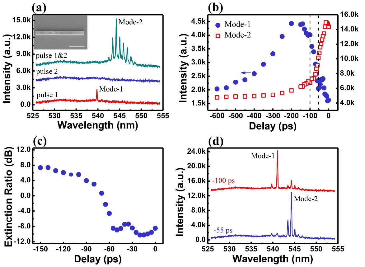 突破二:納米線激光模式轉換機制 在另一項研究中,研究團隊通過全光調製實現不同激光模式之間的轉換,並首次提出將其應用在全光通訊的光開關中。研究論文《全光調控鈣鈦礦激光》(「All-optical control of lead halide perovskite microlasers」)通過研究模態之間非線性相互作用首次實現光開關性能,為光存儲、超快光轉換器等全光片上集成芯片提供了全新的器件設計方案。