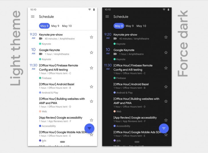Android Q还带来了黑暗主题,当激活节电功能时就会自动开启,或者也可以手动通过快速设置打开。黑暗主题不仅会将系统UI更改为黑色,还会启用支持它的应用的黑暗主题。或者,开发人员可以选择使用新的Force Dark功能,让Android自动创建应用程序现有主题的黑色版本。