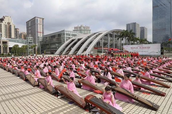 古箏是中國獨特的、重要的民族樂器之一,它的音色優美,音域寬廣、演奏技巧豐富,深受廣大人民群眾的喜愛。上午9:30分,開場舞《茉莉花開》拉開活動序幕,現場500位古箏演奏者同時飛指拔弦,場景甚是壯觀。雖然當日烈日當空,但絲毫沒有影響到每一位演奏者的激情。他們激情的演奏,使整個活動更富有感染力,其優美的旋律,還吸引了一大批前來聆聽的市民。大家心隨樂動,一起感受到音樂所帶來的魅力。