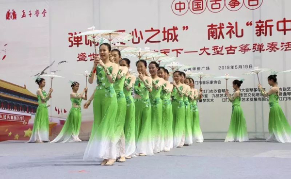 這些古箏演奏者中,有來自江門市 20 多間藝術培訓機構及學校的音樂教師和古箏小學員。他們一起合奏了《春江花月夜》、《金蛇狂舞》和《豐收鑼鼓》經典曲目,最後還與 60 位五邑大學合唱團的學生一起唱奏《我的祖國》,獻禮「新中國 70 華誕」,給到場的市民呈上了一場視聽盛宴。