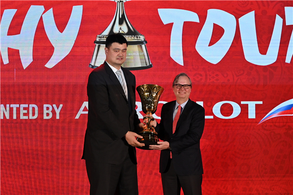 启动仪式上,姚明还将篮球世界杯冠军奖杯“奈史密斯杯”交给了国际篮联媒体与市场总监弗兰克·林德斯。奖杯将在此后的一段时间内在全球五大洲进行巡游活动,与全球的球迷“亲密接触”。