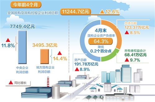 在利润总额中,中央企业7749.4亿元,同比增长11.8%;地方国有企业3495.3亿元,同比增长14.4%。1月至4月,房地产、建筑、石油等行业利润增长较快。