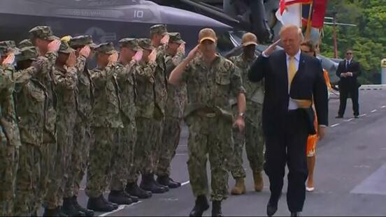 发表讲话后,特朗普和安倍等人来到甲板上,安倍目送特朗普乘直升机离开。在登舰参观“加贺”号后,特朗普还搭乘直升机登上停靠在横须贺基地的美海军“黄蜂”号两栖攻击舰,并在美海军官兵面前发表美日同盟相关讲话。