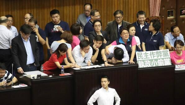 蓝绿“立委”抢占主席台。国民党一方用带有“民主作弊党”字眼的牌子,讽刺民进党。(图:台湾“中央社”)