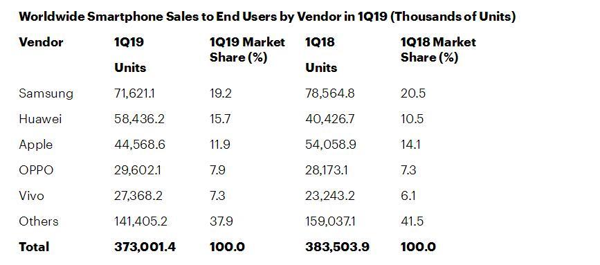 图:2019年第一季度全球智能手机销量数据(按厂商划分)