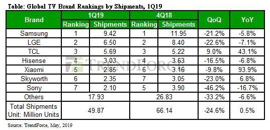 TrendForce最新报告显示,全球电视品牌的出货量在2019年一季度达到4987万台,环比下滑24.6%,同比微增0.5%。其中,三星、LGE在全球市场仍有巨大影响力,国产品牌TCL、海信、小米、创维则包揽了三至六名,为全球电视品牌出货量贡献了近30%市场份额。