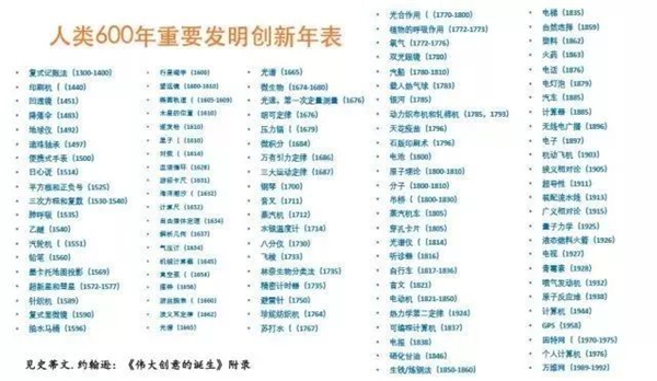 图上都是发明创造的故事,这是我从一本书的附录里看到的人类六百年来的重大发明,你随便扫一眼,想一想如果这些东西都没有,现在的人类会怎样?
