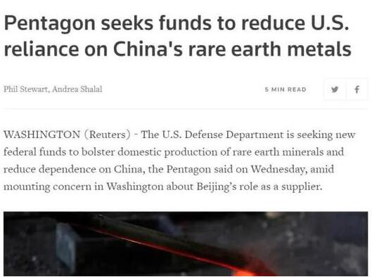 路透社称美国和中国之间日益紧张的关系引发美国担心,在全球最大的两个经济大国之间的贸易战中争取优势,中国可能利用其作为稀土供应国的主导地位。
