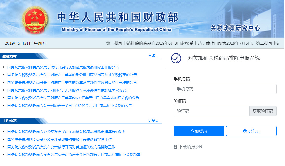 对美加征关税商品排除申报系统于2019年5月31日开通。根据《国务院关税税则委员会关于试行开展对美加征关税商品排除工作的公告》(税委会公告〔2019〕2号),在华企业及协(商)会可通过财政部关税政策研究中心网站(https://gszx.mof.gov.cn)注册、登录,并开始填写排除申请。6月3日排除申报系统将开始接受第一批商品排除申请。