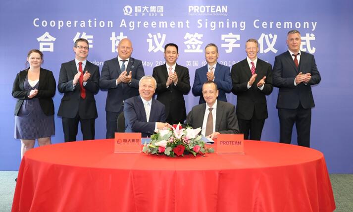 恒大集團董事局主席許家印、恒大國能董事長蔣大龍、Protean董事長兼首席執行官KwokYin Chan、科尼賽克董事長Christian von Koenigsegg、Protean首席財務官NickRich、Protean首席商務官Ben Boycott出席了簽約儀式。