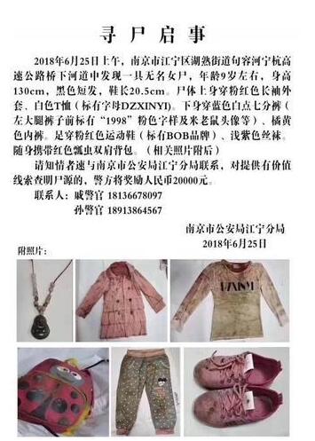 2018年6月26日,南京江宁公安分局官方微博 "@江宁公安在线 " 发布了一则启事,这则寻尸启事称,2018年6月25日上午,南京市江宁区湖熟街道句容河宁杭高速公路桥下河道中发现一具无名女尸,年龄 9 岁左右,身高 130cm,黑色短发。