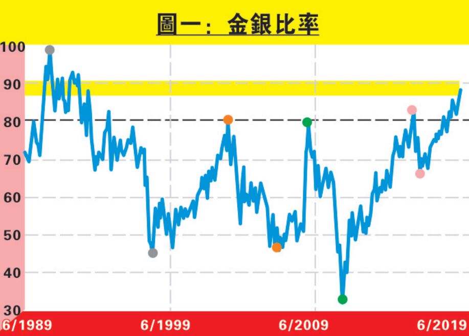 先看金銀比率。商品投資者普遍認為80為重要水平,如圖一的四對標點顯示,當金銀比率觸及80或更高水平而見頂後,將至少回落17倍。這四次調整的觸發點先後分別為Brown Bottom事件、商品大時代、金融海嘯及英國公投脫歐。再細看,每當金銀比率偏高後,白銀價格大幅追上,而不是金價作出調整。在過往30年,金銀比率平均值約在67,而圖一顯示目前金銀比率遠超該水平並觸及26年來新高,因此初步推斷白銀價格目前被低估,並很有可能將大幅回升。
