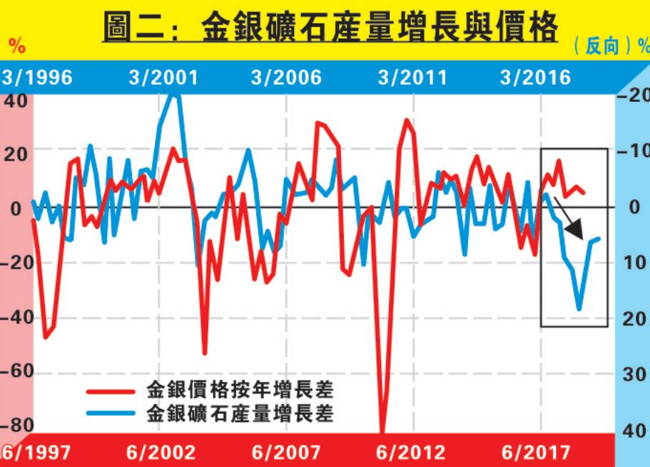 其實,白銀投資價值與黃金相若,不過白銀的應用比黃金更廣泛。圖二可見,金礦石與銀礦石的產量按年增長差在零水平附近窄幅上落,換言之,兩者整體走勢大部分時間相近,不過從黑框可見,兩者增長在近年出現明顯變化,銀礦石近年一度見自有數據以來最大跌幅,可見供應緊張,雖然近月回升,但仍處於多年來的較低水平,支持推升白銀價格。因此圖二可見,金銀礦石產量增長差與價格按年增長差呈反比,前者領先後者約五季。按黑箭預示,金銀價格增長差下行壓力較大,料銀價增長將回升。