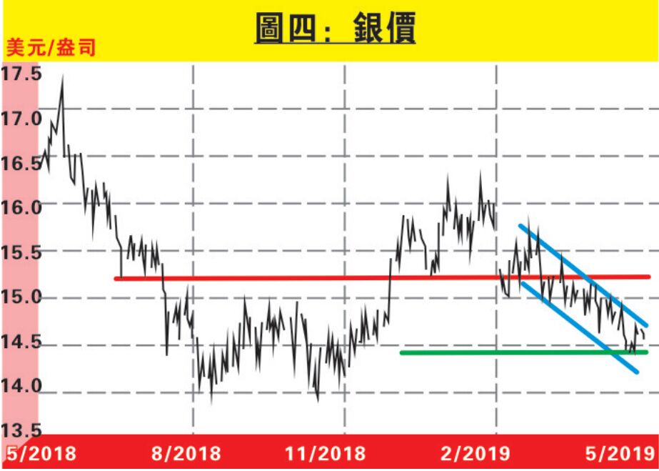 技術上,MACD顯示白銀呈買入信號,料價格短線回升。圖四顯示,銀價短線14.38美元成支持,而自3月初以來形成下降軌,料升穿通道頂上望15.20美元。