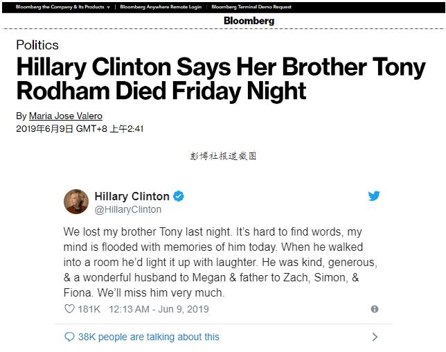【环球网报道记者崔天也】8日,美国前国务卿和总统候选人希拉里·克林顿在推特上发文,称其弟弟托尼·罗德姆于7日晚去世,终年65岁,死因不详。