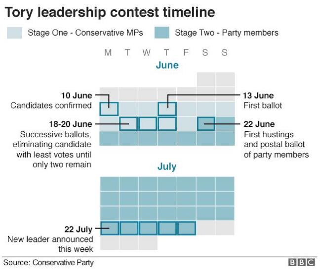 英国保守党需要一个月的时间来确定最后的首相人选,并在7月22日之后正式对外公布。新首相人选需经英国女王伊丽莎白二世批准,任期至下次大选。