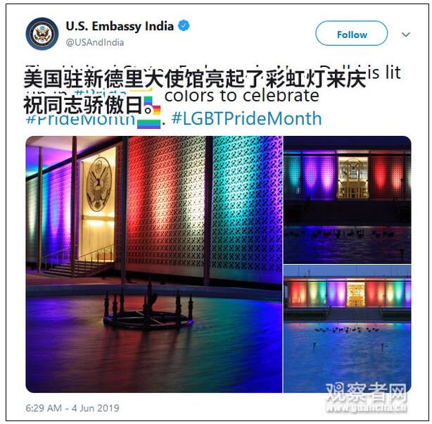 位于印度新德里的美国大使馆发布了一则推特,展示了被彩灯照亮的大使馆建筑立面。