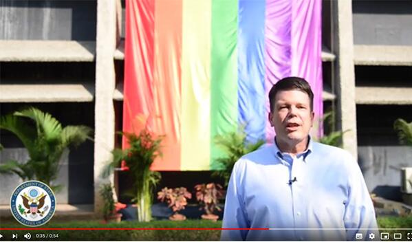 美国驻印度钦奈总领事馆发布了一则总领事在巨大的彩虹旗前讲话的视频。